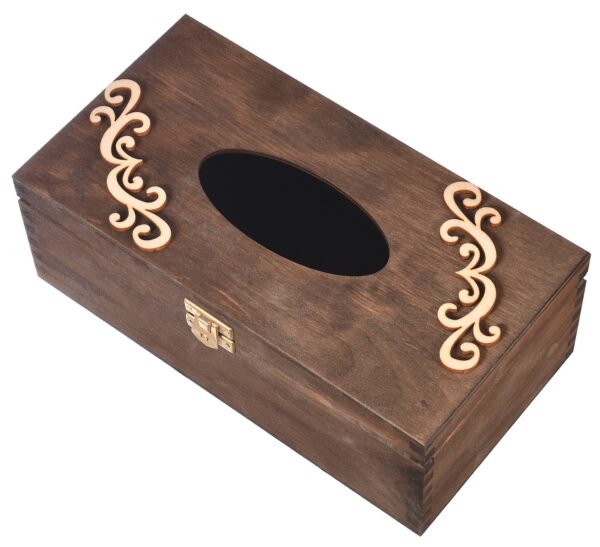 Drewniane pudełko na chusteczki, chustecznik w kolorze brązowym z ozdobnymi dekorami w stylu rustykalnym. Dekoracyjny pojemnik przypasujesz do większości wnętrz jest bardzo efektowne, jeśli nie masz pomysłu na prezent? My podpowiadamy że pudełko będzie idealnym rozwiązaniem.
