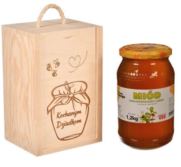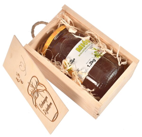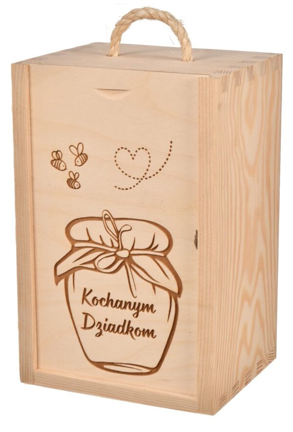 Drewniana skrzynka pozwoli na przechowywanie oraz przenoszenie słoika o pojemności nawet do 1,2 kg miodu.