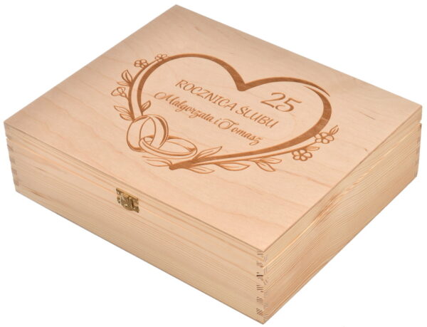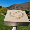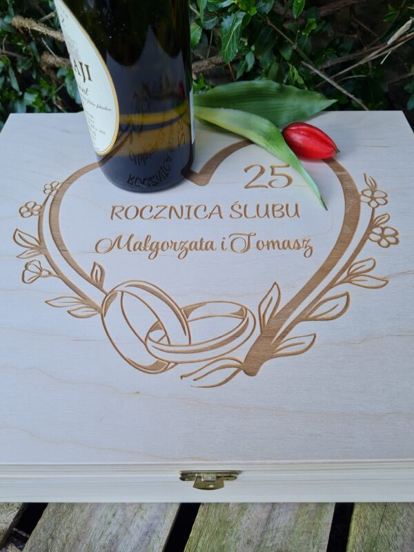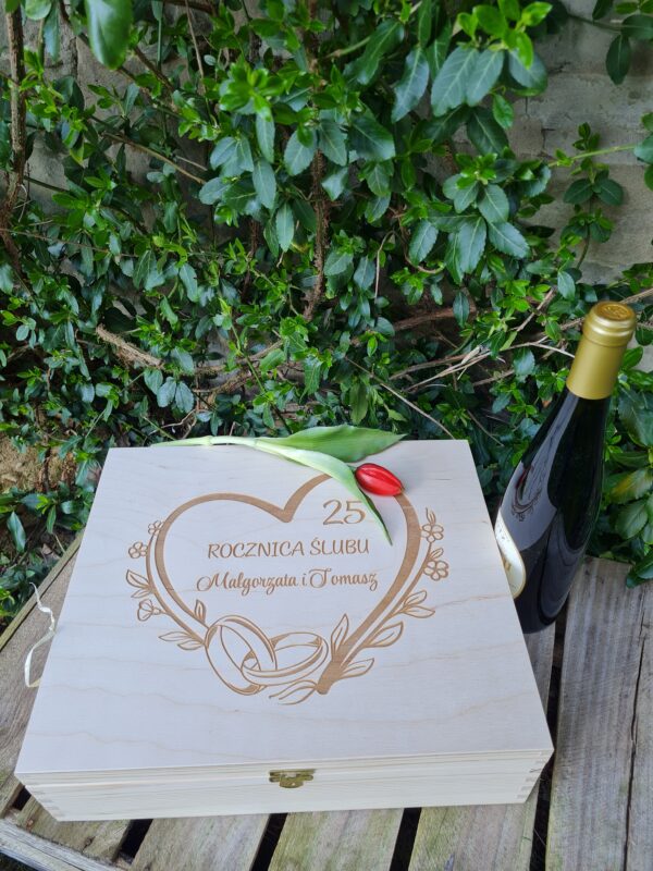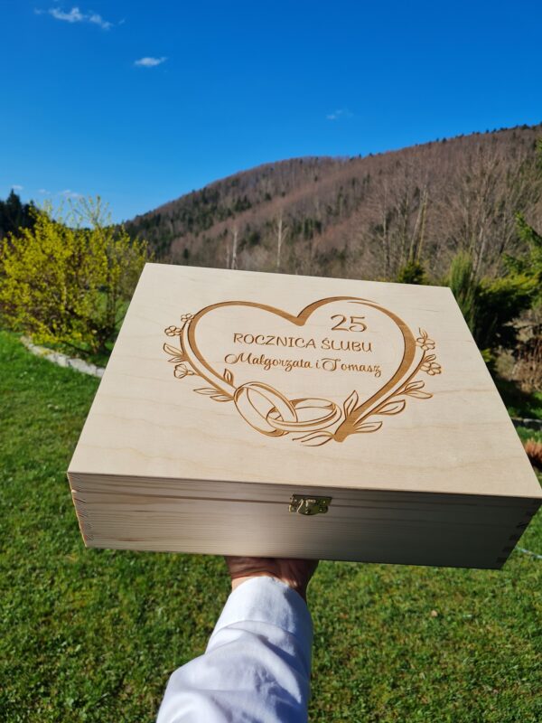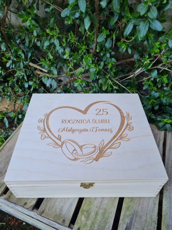 Każde pudełko wykonujemy na indywidualne zamówienie – możesz dodać imiona, datę ślubu, cytat lub dedykację, dzięki czemu staje się ono niepowtarzalnym, emocjonalnym prezentem.