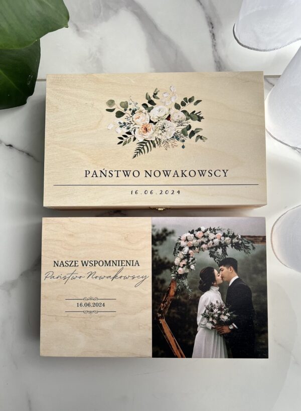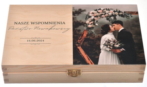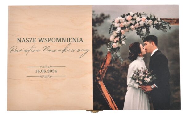 Dodaj swoje dedykowane życzenia, datę ślubu czy imiona. - Trwałość i Jakość: Drewno jest trwałym materiałem, co gwarantuje długotrwałe przechowywanie zdjęć i wspomnień. Solidna konstrukcja pudełka zapewnia ochronę dla zawartości.