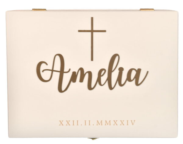 Funkcjonalność – Po wręczeniu prezentu może być wykorzystane do przechowywania pamiątek z Chrztu, takich jak zdjęcia, świece czy pierwsze buciki dziecka.