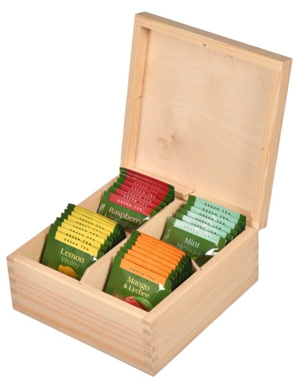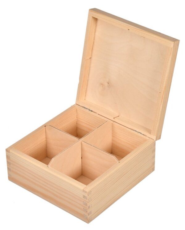 Pudełko na herbatę wykonane  z naturalnego drewna ekologicznego nadają się najlepiej do przechowywania różnego rodzaju herbat i ziół,tych w torebkach jak i liściastych.Podział na 4 przegrody pozwala przechowywać herbaty o różnych smakach w jednym miejscu. Nasze pudełko jest niezbędnikiem nie tylko na herbaty ale również może być przydatne na przyprawy w twojej kuchni. Prezentowane drewniane pudełko na herbatę to doskonały wybór, ponieważ jest to pojemnik wytrzymały.Jeśli chcesz żeby herbaciarka stanowiła ozdobę w Twojej kuchni możesz ją pomalować na dowolny kolor lub ozdobić znaną i bardzo lubianą techniką decoupage.