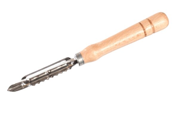 Obieraczka z drewnianą rączką. Jest bardzo solidnie wykonana przez co będzie służyć Państwu przez lata Posiada ruchomą część dzięki, której bardzo łatwo się jej używa.