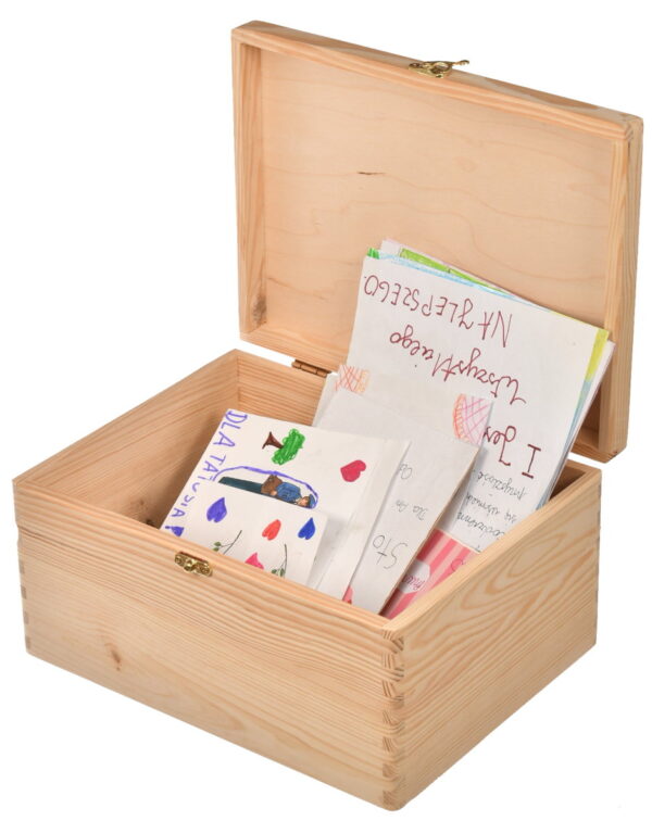 Przechowuj rysunki i prace plastyczne swojego dziecka w wyjątkowy sposób! Drewniane pudełko o wymiarach 30x20x13 cm, wykonane ręcznie z litego drewna sosnowego oraz sklejki, to eleganckie i trwałe rozwiązanie do przechowywania pamiątek. Dzięki technologii nadruku UV możesz spersonalizować organizer według własnego pomysłu – dodaj dowolny tekst, imię dziecka, jego rysunek lub ulubiony obrazek, tworząc unikalny i sentymentalny upominek.