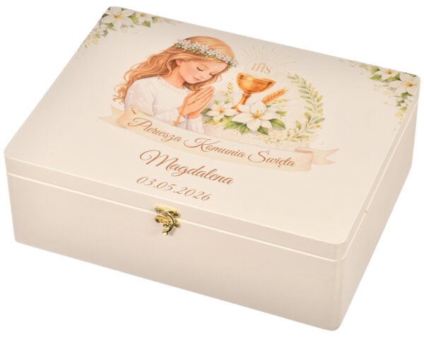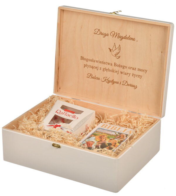 Eleganckie, duże białe drewniane pudełko z personalizacją to wyjątkowy pomysł na prezent z okazji Pierwszej Komunii Świętej. Na pokrywie znajduje się piękny, bardzo trwały nadruk, a wewnątrz precyzyjny grawer z życzeniami i dedykacją, dzięki czemu staje się nie tylko opakowaniem, ale także niezwykłą pamiątką na lata.
