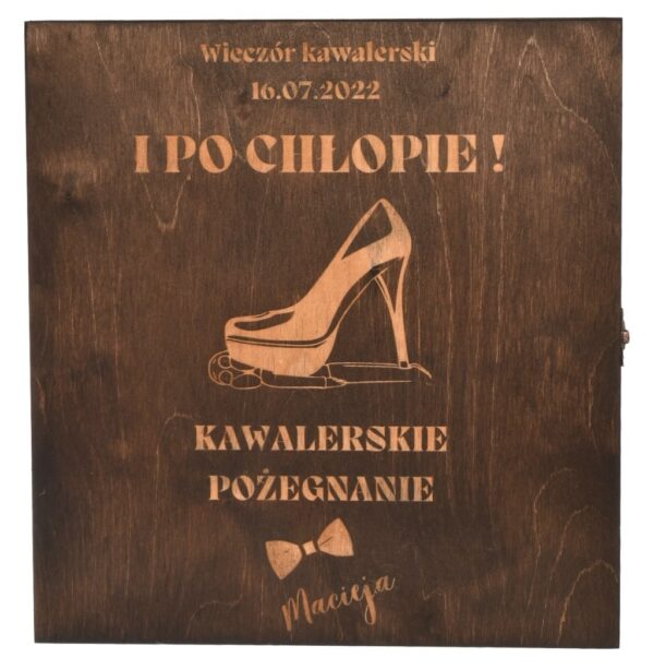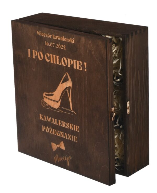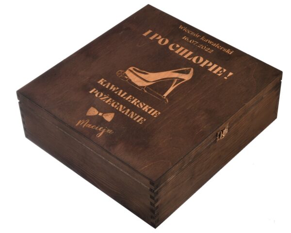 Nie masz pomysłu na unikalny prezent dla kolegi na wieczór kawalerski? Przedstawiamy idealną i uniwersalną propozycję, jaką jest nasze drewniane pudełko na whisky 1 Litr i 6 szklanek w kolorze brązowym z grawerem, zamykane na metalowe zapięcie. Produkt jest w 100% Polski i świetnie nada się jako prezent, w szczególności dla fanów wysokoprocentowych trunków, na każdą okazję jak m.in. wieczór kawalerski,urodziny, imieniny, rocznica czy jubileusz. Do pudełka zapakuj ulubiony alkohol lub karafkę wraz ze szklankami i obdaruj nim kolegę, tatę, teścia, dziadka, męża lub chłopaka.