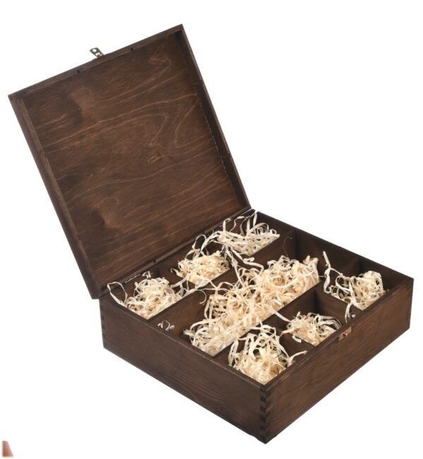 Drewniane pudełko jest wypełnione wełną drzewną, dzięki czemu zabezpieczysz szkło przed uszkodzeniami, a dodatkowo upiększysz wygląd ofiarowanego podarunku. Drewniane pudełko jest bejcowane na kolor brązowy.
