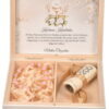 Lewa przegroda ma wymiary 10 x 6,8 cm. To bardzo uniwersalna przestrzeń. Nasi klienci najczęściej umieszczają tam pralinę/czekoladkę, łańcuszek z krzyżykiem, zegarek dziecięcy, pamiątkową monetę lub tradycyjnie – różaniec. To Ty decydujesz, jak skompletujesz prezent.