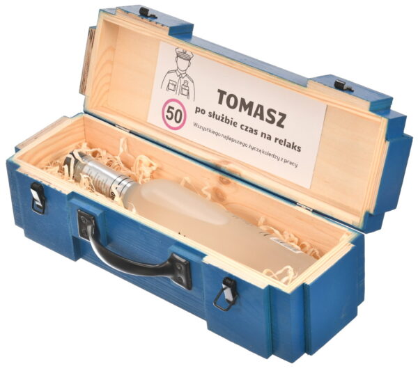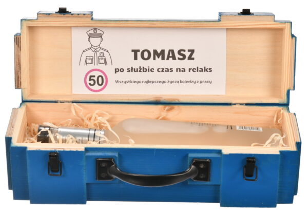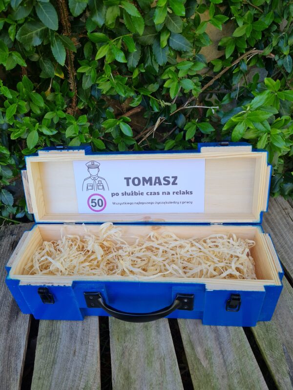 Drewniana Skrzynka Prezentowa dla Policjanta – Stylowy Zestaw Relaksujący z Personalizacją i Uchwytem