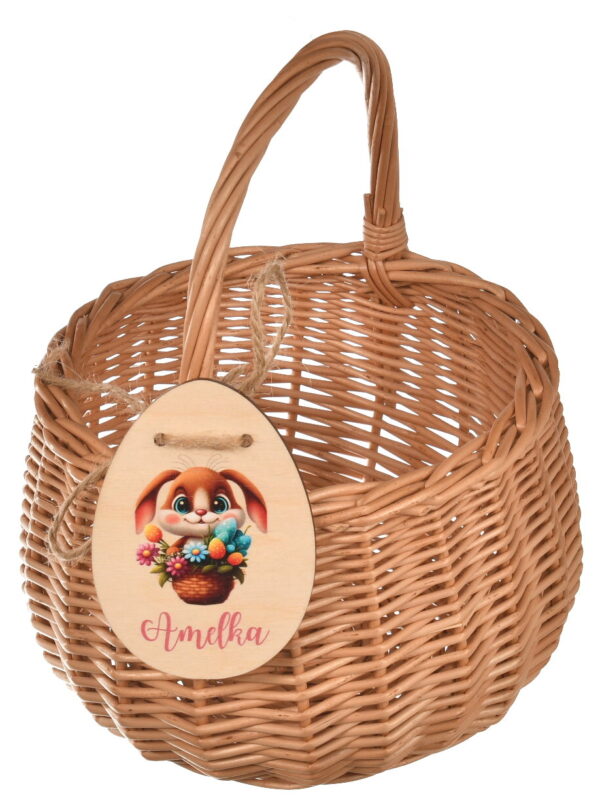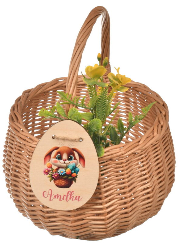 Uroczy, wiklinowy koszyczek wielkanocny dla dziecka, idealny do święconki. Koszyczek jest personalizowany – na życzenie dodajemy dowolny napis z imieniem dziecka, co sprawia, że jest to wyjątkowy prezent na Święta Wielkanocne. Wykonany z wysokiej jakości wikliny, trwały i estetyczny, doskonale nadaje się do tradycyjnego święcenia pokarmów.