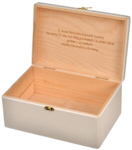 Drewniana szkatułka na Komunię Świętą – z imieniem i datą